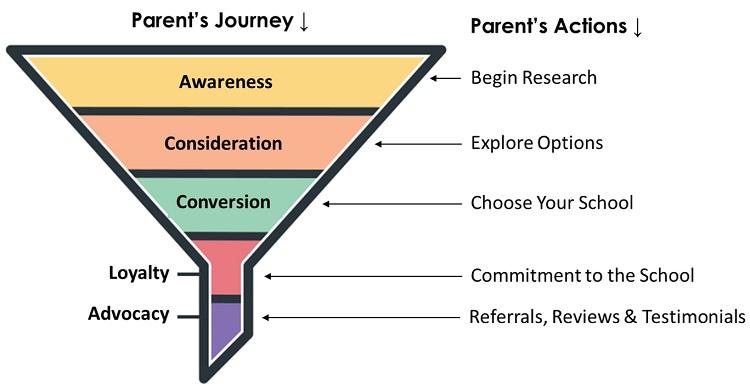 According to HubSpot, there are three main phases to a person’s search. First, in the awareness stage, a parent is aware of a need or a challenge and begins to research the issue. During this stage, they begin to further clarify their needs as they learn more and essentially make a list of key things they are looking for in a school. Next, they move into the consideration stage in which they are looking for specific options that best meet their needs. It’s at this stage that they may contact you for information or to schedule a tour. Then, in the decision stage, the parent is choosing between their top choices.